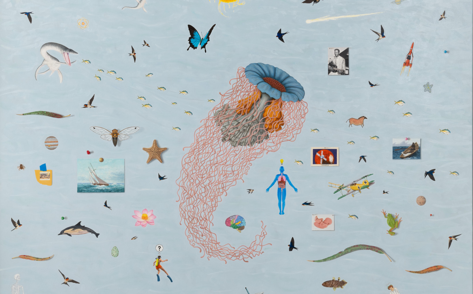Sullivan’s imagery often draws from diverse knowledge systems—ranging from science and superstition to mythology and natural history—layered with collagist and trompe-l’oeil techniques that recall the flatness and intricacy of Ukiyo-e prints. His works invite close observation: what at first glance appears whimsical or absurd gradually reveals deeper narrative currents, rendered with painterly precision and luminous detail.