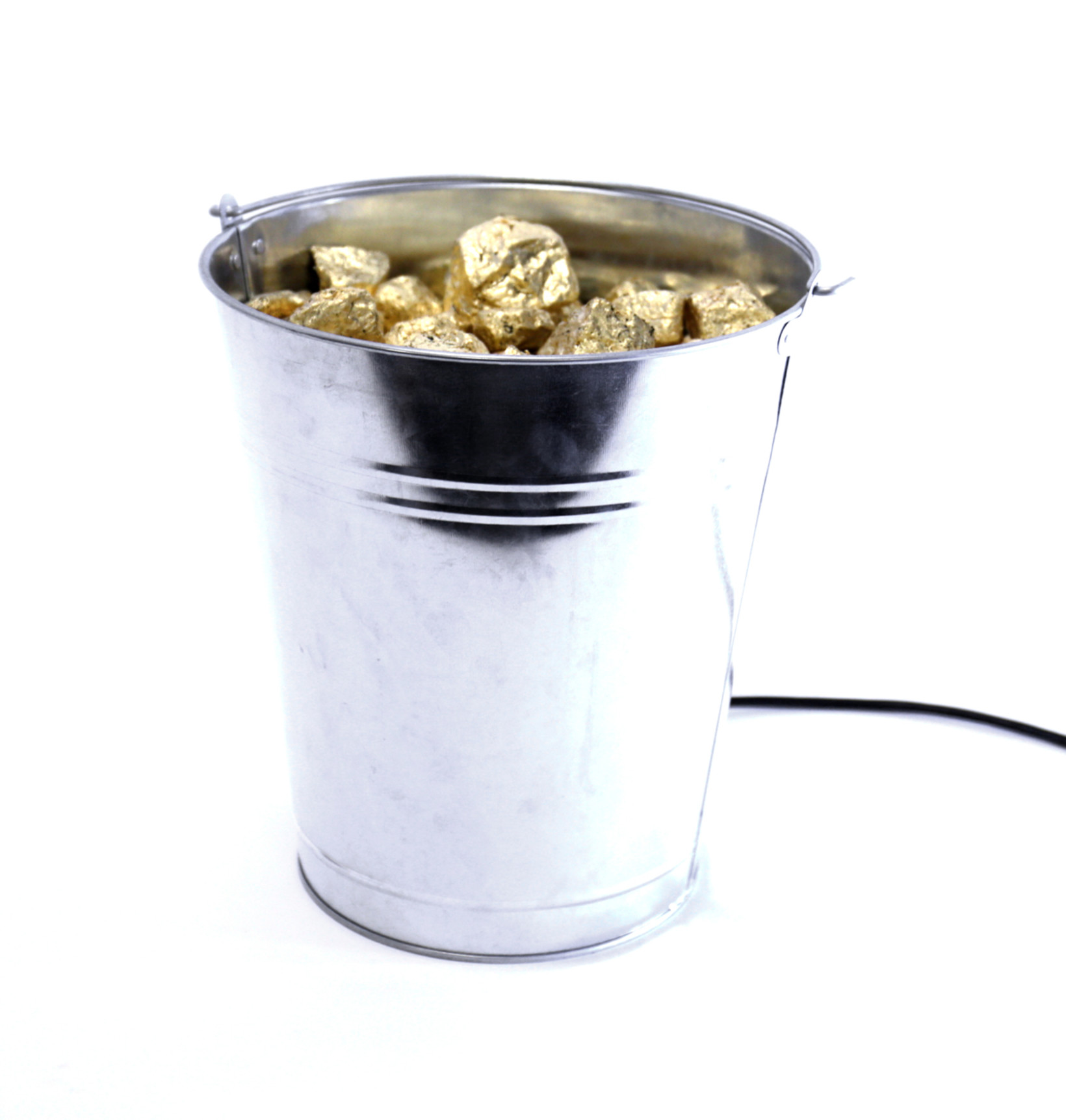 2015 \ Edition size: 3 \ Coal, gold leaf, stainless steel bucket and electrical components \ 29x26x26cm