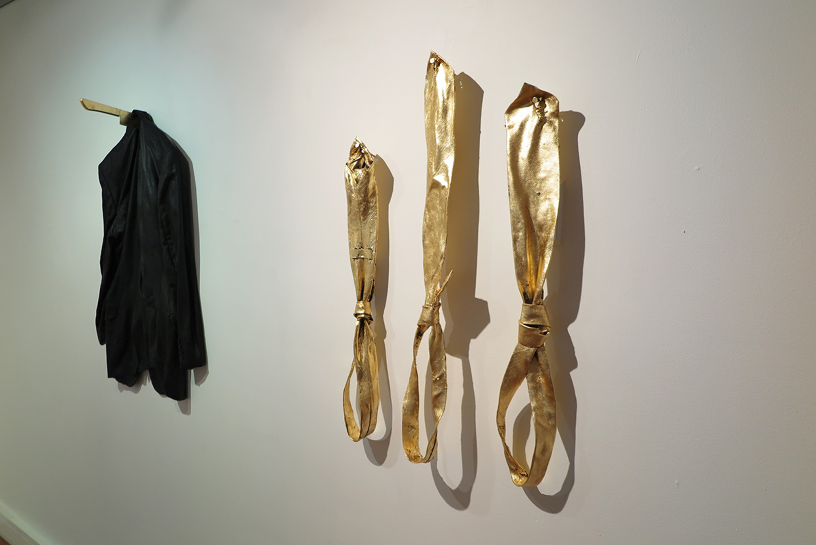 2015 \ Coal, fabric, flock, resin, pigment and gold leaf with brass-plated butcher hook and chain \ 163x31cm