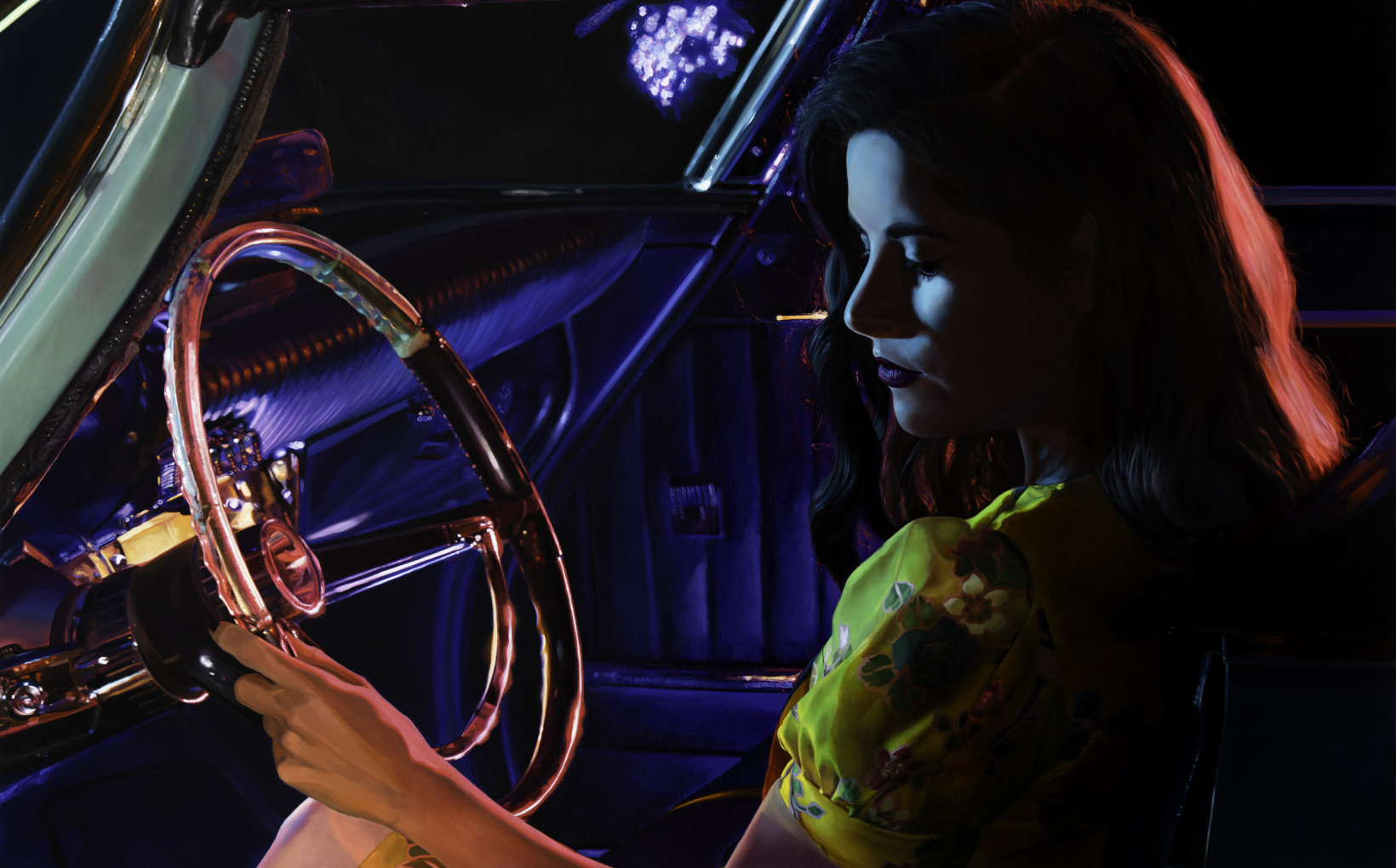 Known for her meticulously constructed interiors and the women who inhabit them, Dianne Gall has shifted her lens from the domestic rooms of her earlier works, to the charged, cinematic interiors of vehicles. In DRIVE, the central motif remains: women in states of solitude, contemplation, or escape. Only now, they are set against the gleam of chrome, the sweep of headlights, and the open-ended narrative of the road.