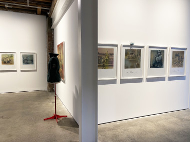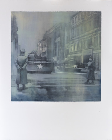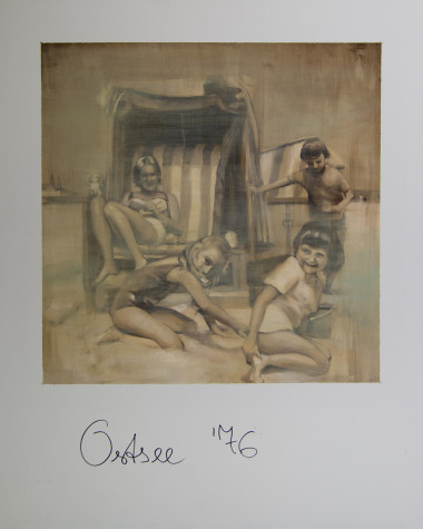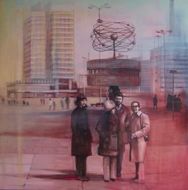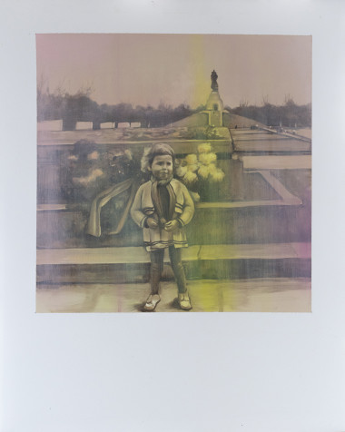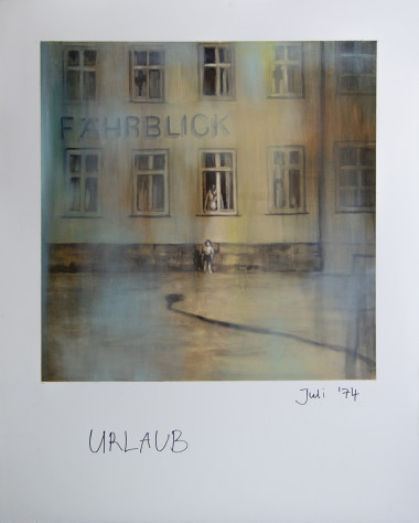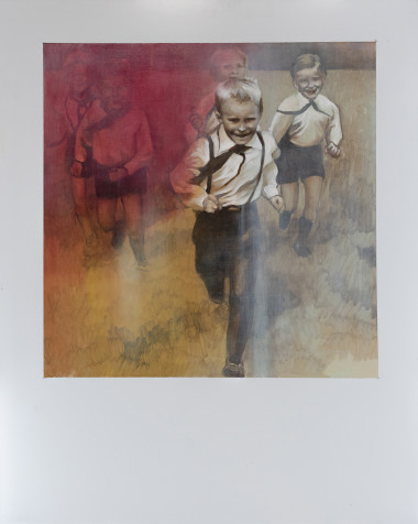 For the artist, memory is not always bleak—family and life bring their own colour. Longhurst’s investigation draws on the photography from her personal history alongside some of the more iconic documented moments from post-war Germany. Paintings are reimagined as polaroid images, complete with light bursts disrupting the picture plain—faded splashes of colour that humanise the workers’ utopia. Her painterly interference of the image shines a light on the imperfect notion of memory. It is particularly poignant in the hands of this artist, who has humanised the realities of geopolitical history. The occasional appearance of text locates the imagery in a personal context—the audience becomes active participants in her journey.