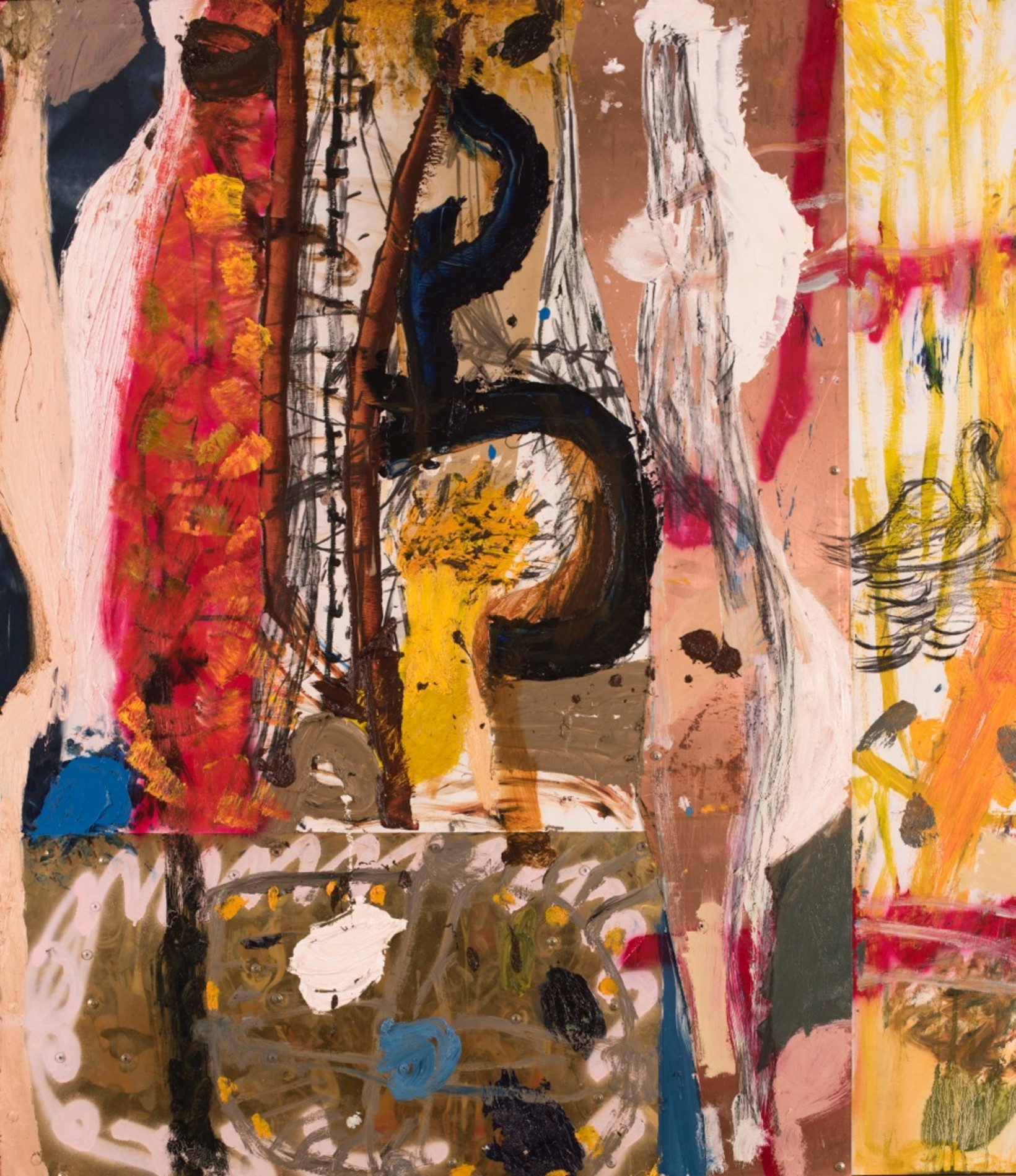 2017Oil, copper, brass, charcoal and studio debris on hardboard140x122cm
