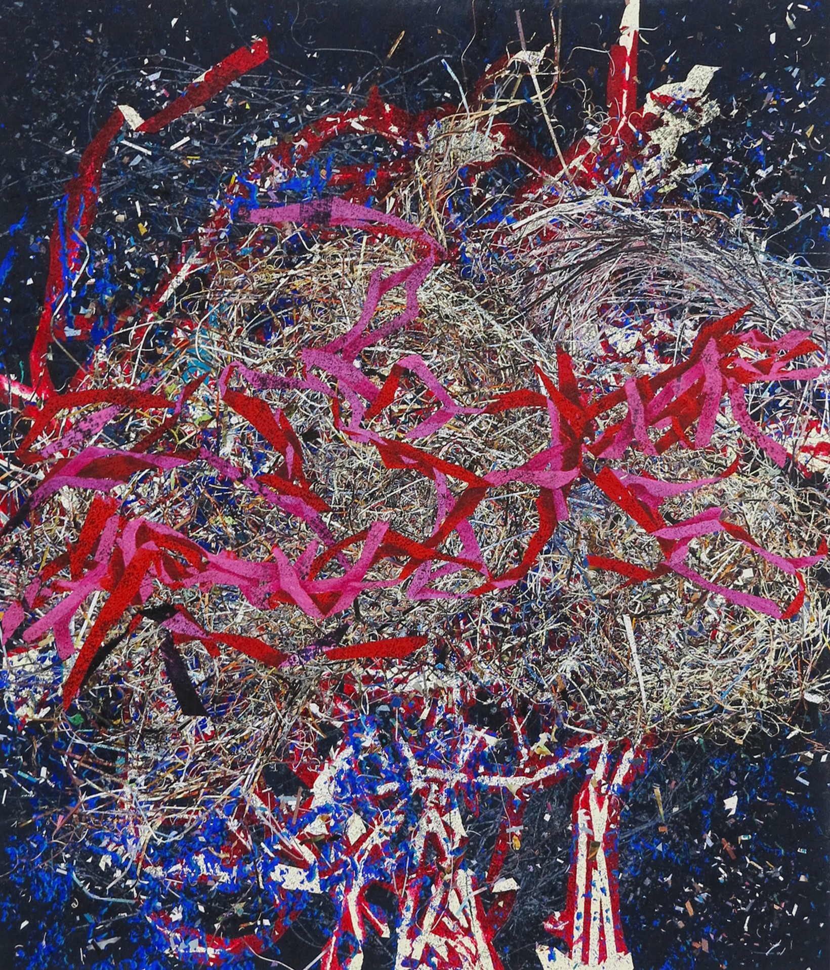 Acrylic paint, pastel, colour pencil on layers of silk and paper