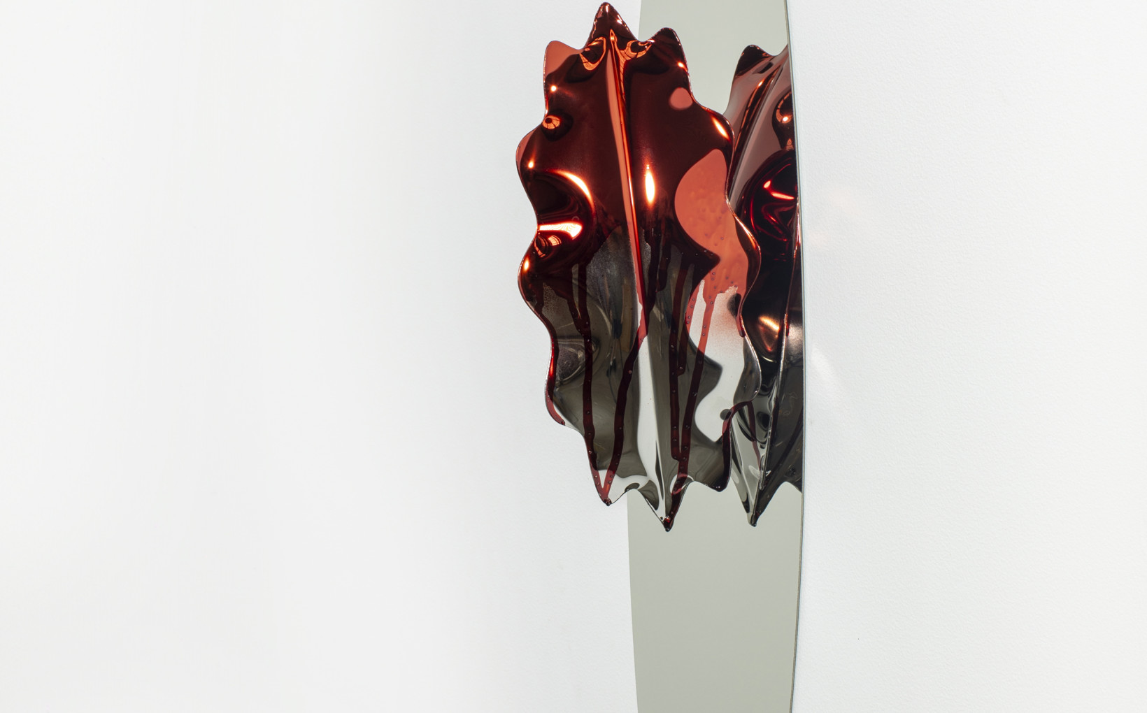 Materially, their reflective surfaces refuse to give the viewer what they expect. They act as distorted mirrors, catching glimpses of us and the room around them, folding reality back into itself until form and object blur. As with much of Snape’s work, the surfaces conceal as much as they reveal. To look at them is to confront your own image—distorted, refracted, unreachable—inviting recognition of our own complicity in desire.