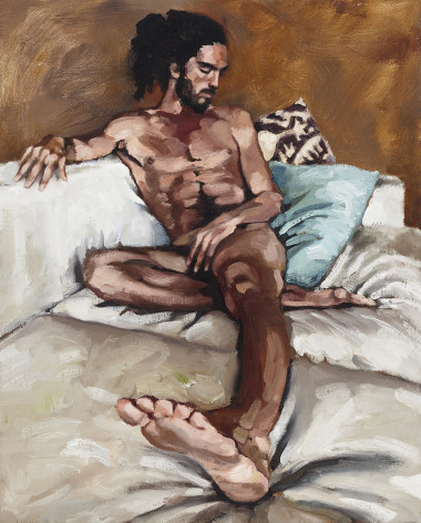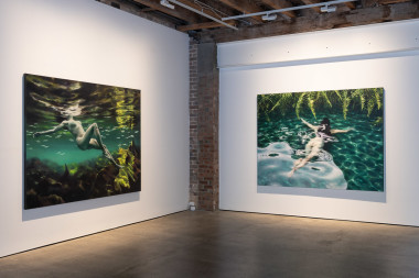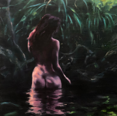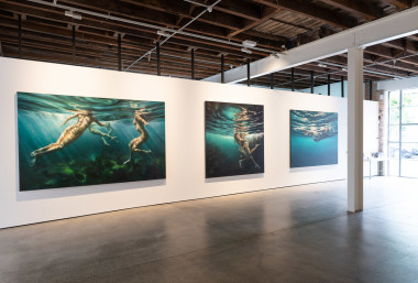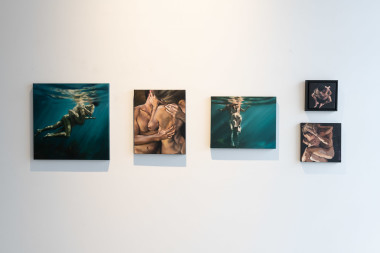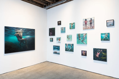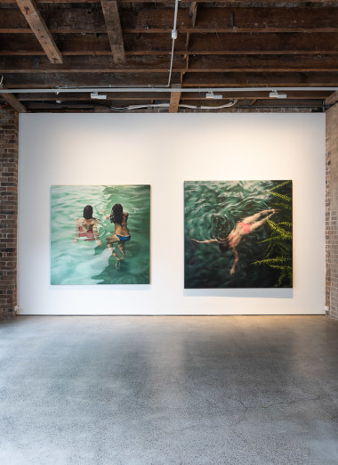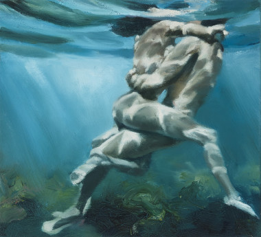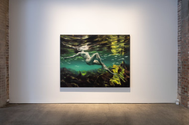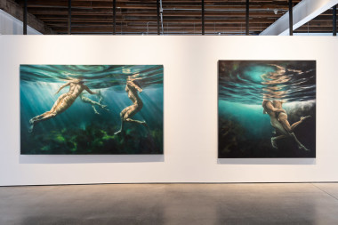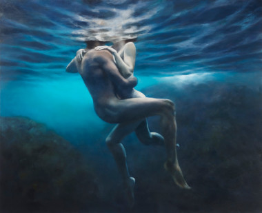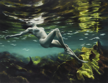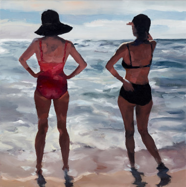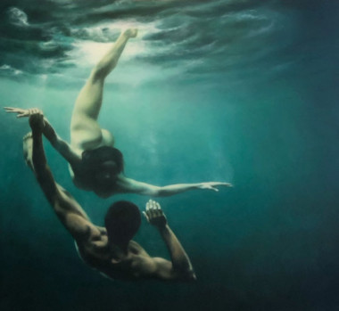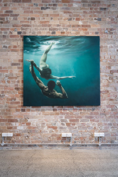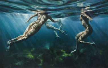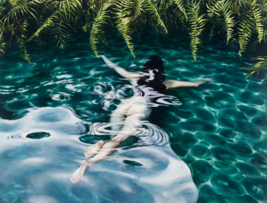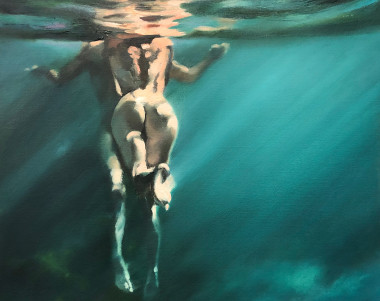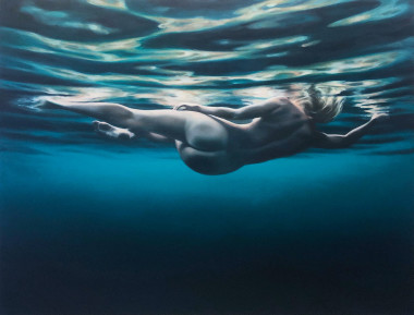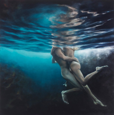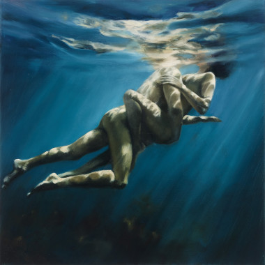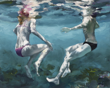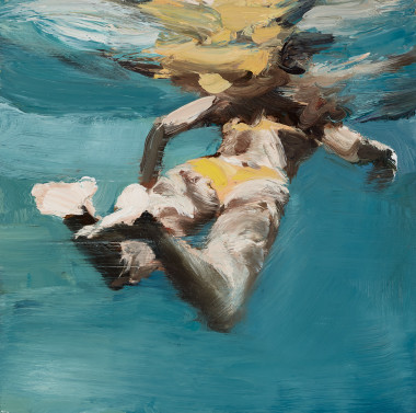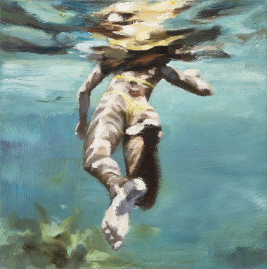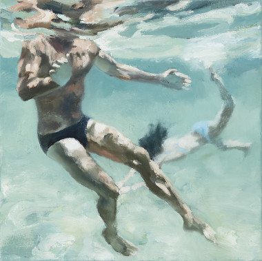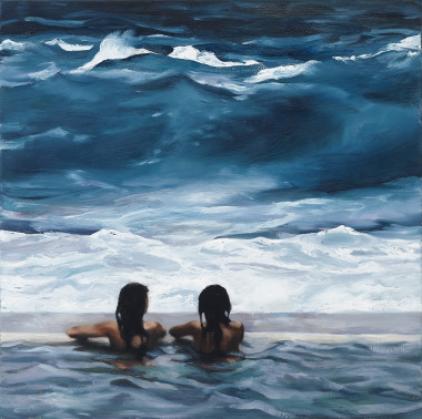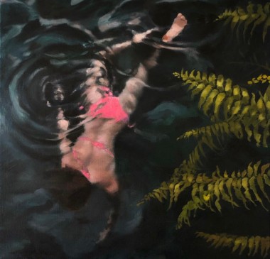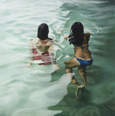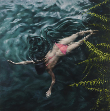 Emdur’s muse has long been the ocean. Her paintings are carefully rendered to capture and express the immersive quality of the ocean and its currents, whilst luminously portraying the light and ripples reflected from the sandy shallows onto the figures. The depths, with figures dancing and suspended in space, connect us not only to the natural world, but the nostalgia of childhood and the enticement of a time when you felt the cool elements against your skin. At times, a siren swims through the undercurrent of turquoise lace. In other works, we see a flash of colour—the bikini a lure to the eye.