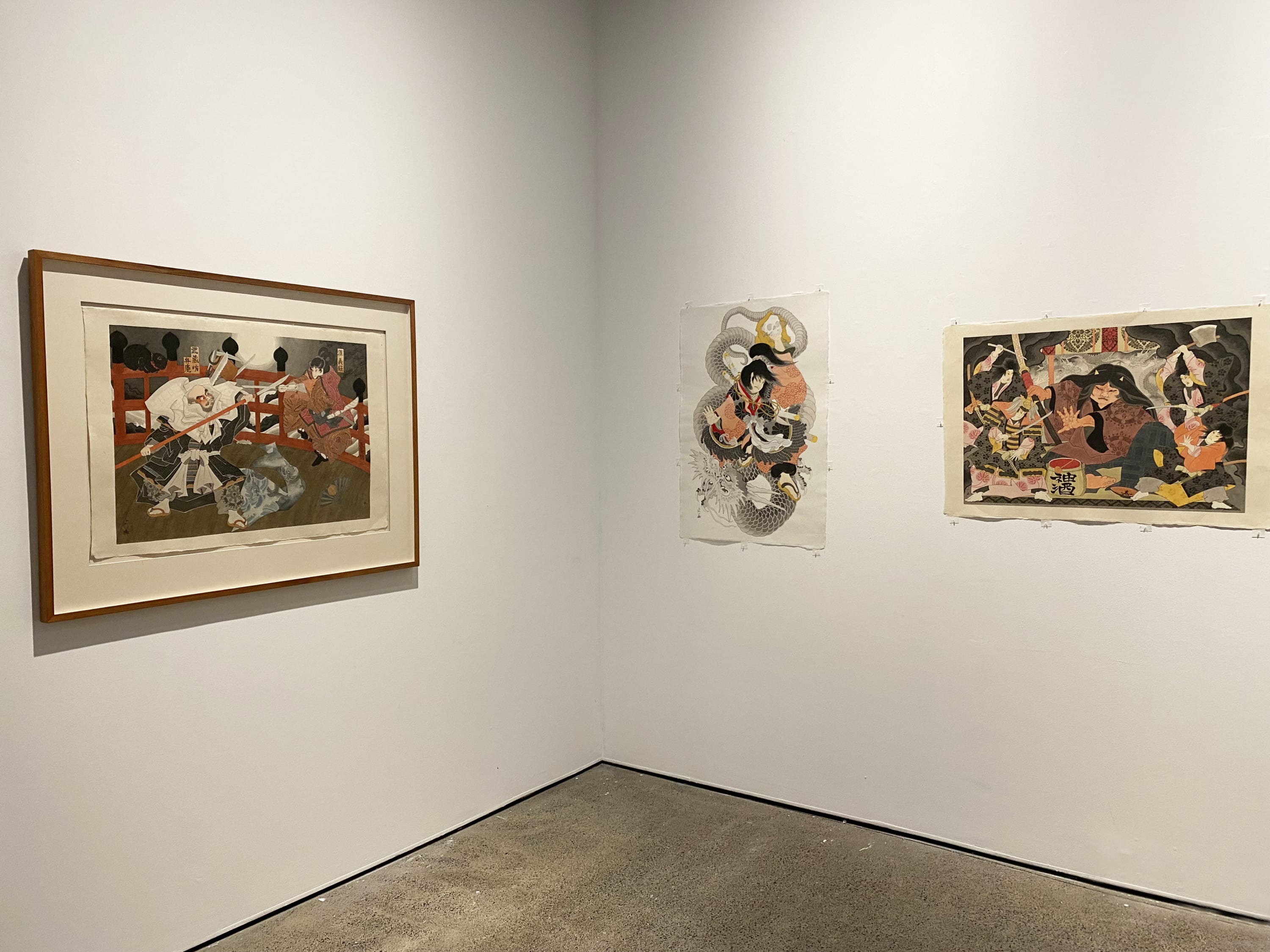 Honjo paints with great sensitivity and an acute understanding of materiality. Handmade from mulberry fibres, the traditional Kozo washi paper on which Honjo works provides an organic backdrop for his artistry. Despite appearing delicate, the paper has a sturdiness that offers longevity. Honjo works confidently on such material given his decade-long practice of Japanese Irezumi tattooing, where skin becomes the artist’s working surface. In both cases, there is no room for error. The permanence of stories inked both on skin and paper allows Honjo’s fantastical narratives to stay alive.