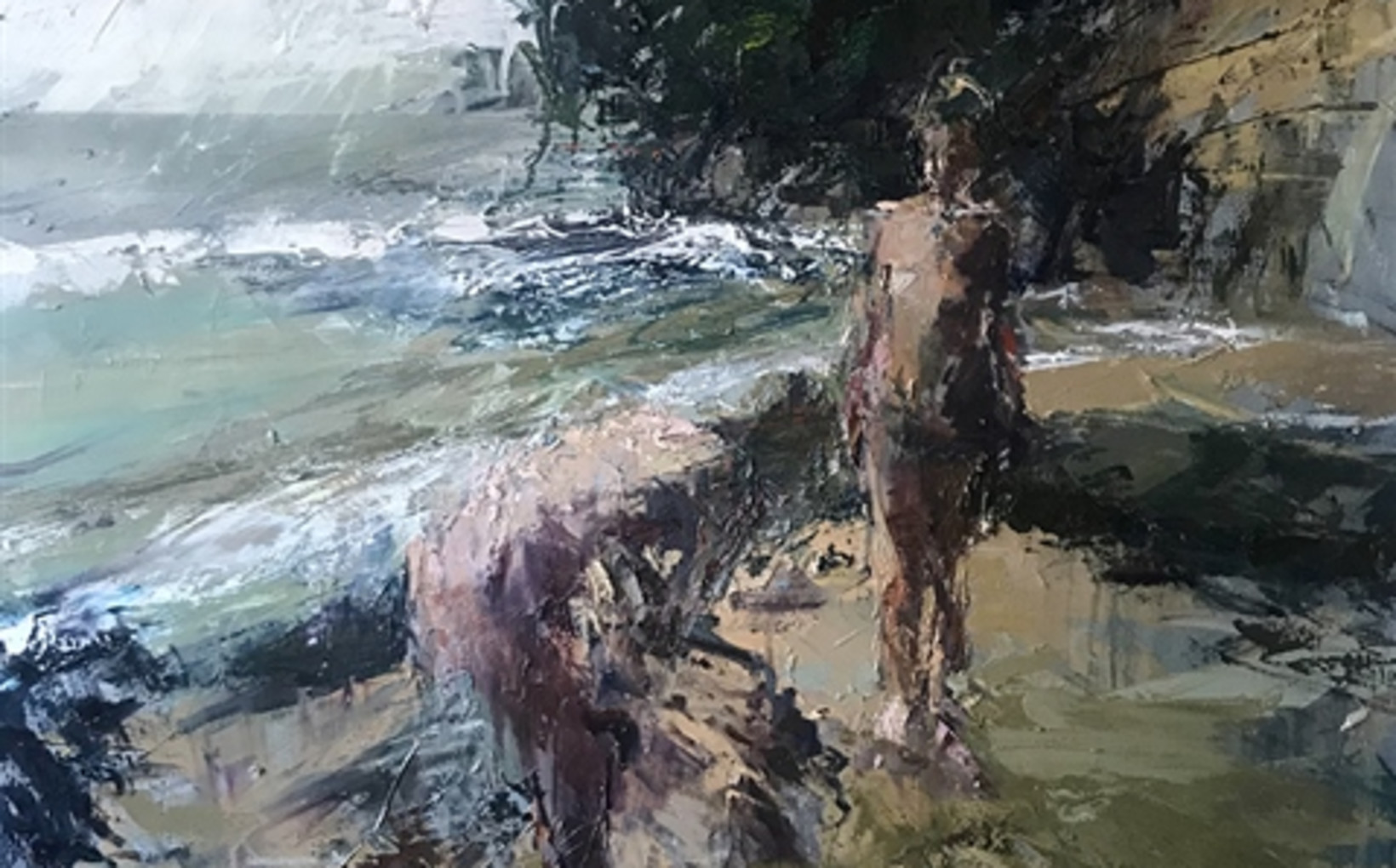 "This beautifully composed painting may be a landscape (or seascape) but it is one that pivots around the formation of the two female figures. Their connection to each other and to their beach setting is the true subject of the work. Despite the agitated surface texture of this painting; one that encapsulates the perpetual motion of the ocean setting, the work exudes a great sense of calm and intimacy. The figures here do indeed appear as ‘sea creatures’ as they are drawn into their environment, and lead us, as viewers, in with them. What small detail, we wonder, that has caught their attention on the shore?