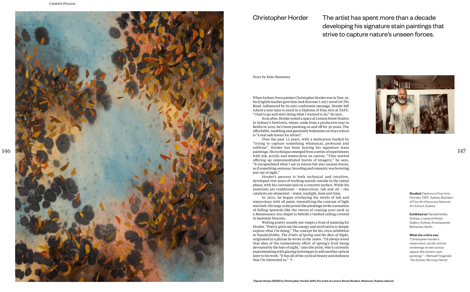 Writing poetry usually pre-empts a bout of painting for Horder. “Poetry gives me the energy and motivation to deeply explore what I’m doing.” The concept for his 2024 exhibition at Nanda\Hobbs, The Fruits of Spring and the Bats of Night, originated in a phrase he wrote in the 1990s. “I’d always loved that idea of the tremendous effort of spring’s fruit being devoured by the bats of night,” says the artist, who’s currently experimenting with glazing techniques to add another optical layer to his work. “It has all of the cyclical beauty and darkness that I’m interested in.”