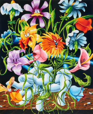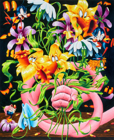 Philjames is a Sydney-based artist whose multidisciplinary practice spans painting, sculpture and drawing. His work is characterised by a distinctive process: carefully reworking vintage paintings and prints by inserting figures from mid-20th century animation, most often characters from the worlds of Disney and Looney Tunes. These surreal juxtapositions, rendered with the precision of a conservator, both disrupt and reanimate the original artworks. While his imagery often draws on humour and nostalgia, the results are far from frivolous; the playful surface conceals deeper tensions about time, belief systems and the blurred lines between high and low culture.