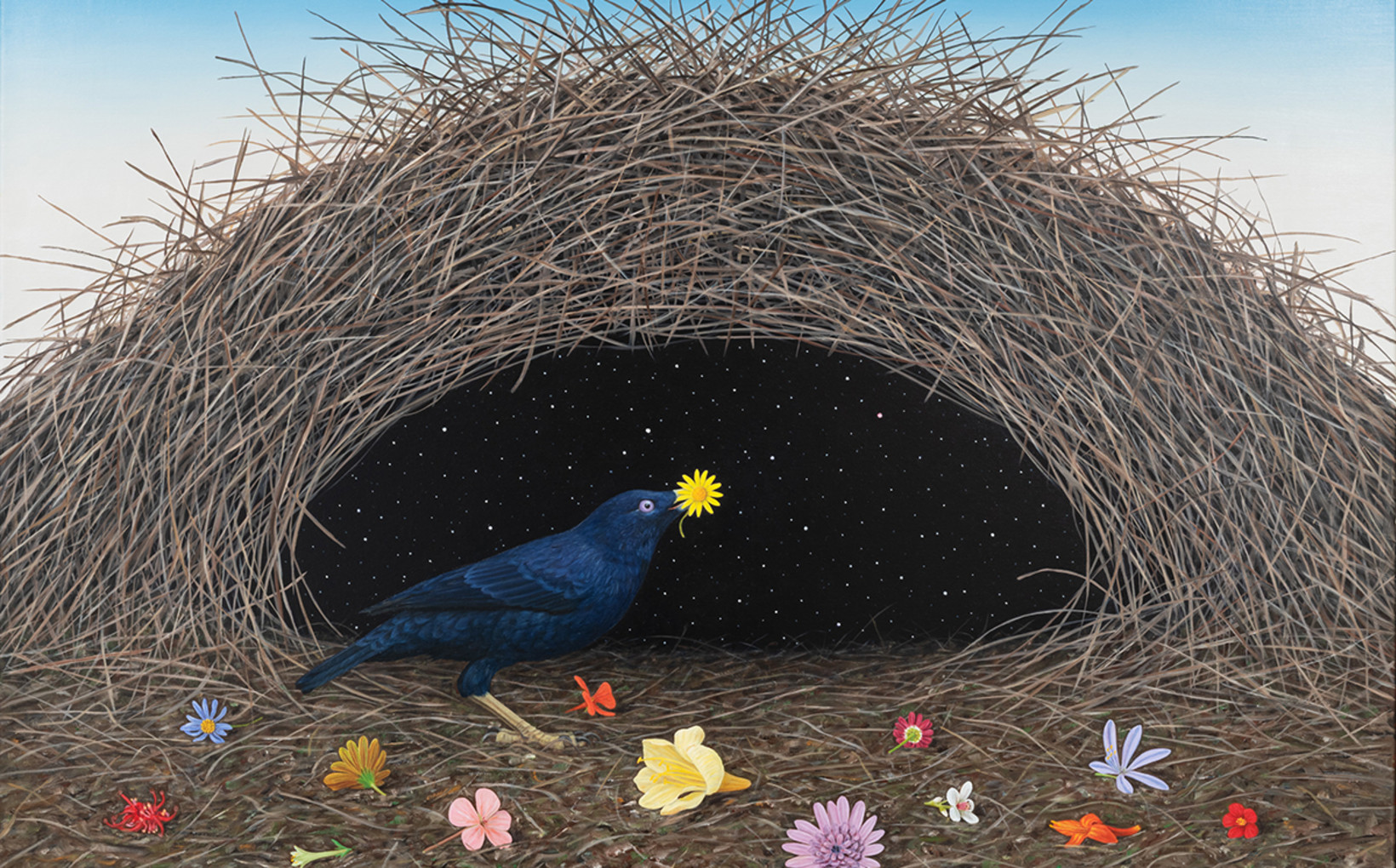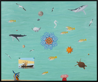Sullivan’s imagery functions as a living archive of inquiry. Animals, celestial symbols, geological forms and weather systems are arranged like constellations; each painting a navigational chart without fixed coordinates. Like the anatomical layers of printed acetate in a children’s encyclopaedia, his paintings encourage us to peel back his surfaces to find other structures: oceans that are also dreams, landscapes that are also the mind, creatures that move between unmappable worlds.
