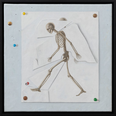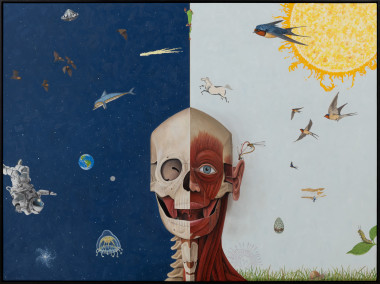 In one work, a frog ascends the fine line between the conscious and subconscious, dissecting an anatomical head from a children’s pop-up book. In another, a sea dragon drifts through an ocean in outer space. Figures and creatures reappear as recurring markers, each holding fragments of meaning, yet resisting singular interpretation. The artist’s own life becomes entwined with the imagery, as paintings begun in reflection seem to foreshadow experiences yet to come.